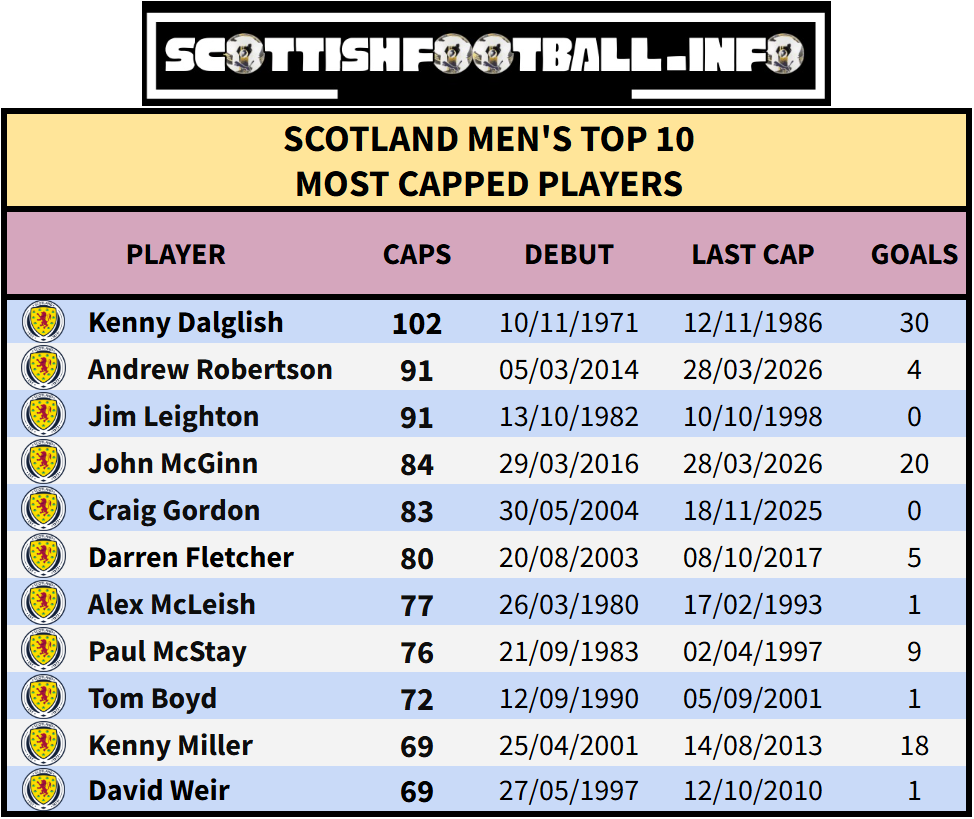 If Robertson appears in every Scotland match this year, he will become Scotland’s most capped male player by the end of 2026 - even if we are eliminated in the World Cup group stages.