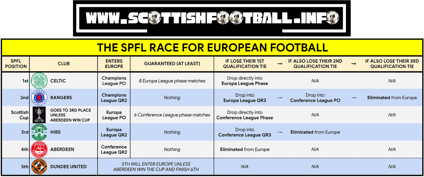 Now that Celtic will face Aberdeen in the Scottish Cup Final, the teams that finish 1st-5th in Scotland will all enter Europe next season - unless Aberdeen win the cup and finish 6th.