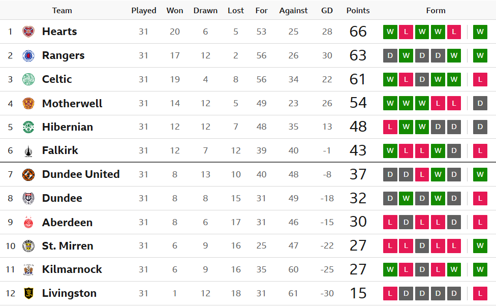 With 7 matches left to play, and just two games before the league splits in two, the title race remains extremely tight in Scotland. It’s the first time since 1994/95 that any team other than Rangers have had a better goal difference than Celtic at this stage of the season. Celtic have been champions in 13 of the past 14 seasons, yet currently sit in third place - five points behind Hearts and two points behind Rangers in second. Both Motherwell and Hearts not only have a better GD than the Hoops, but both have also lost three fewer matches.