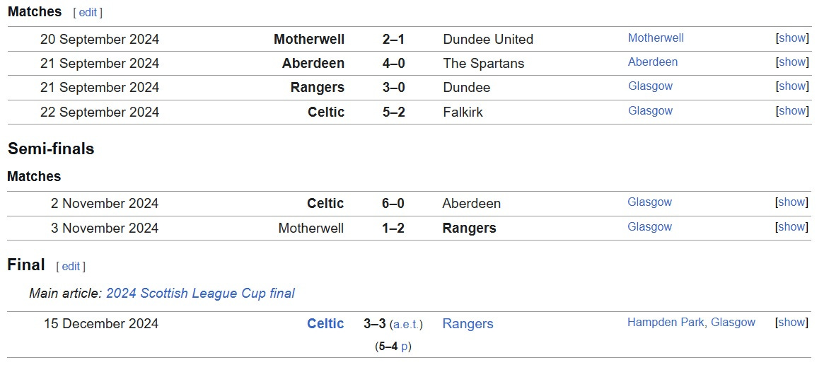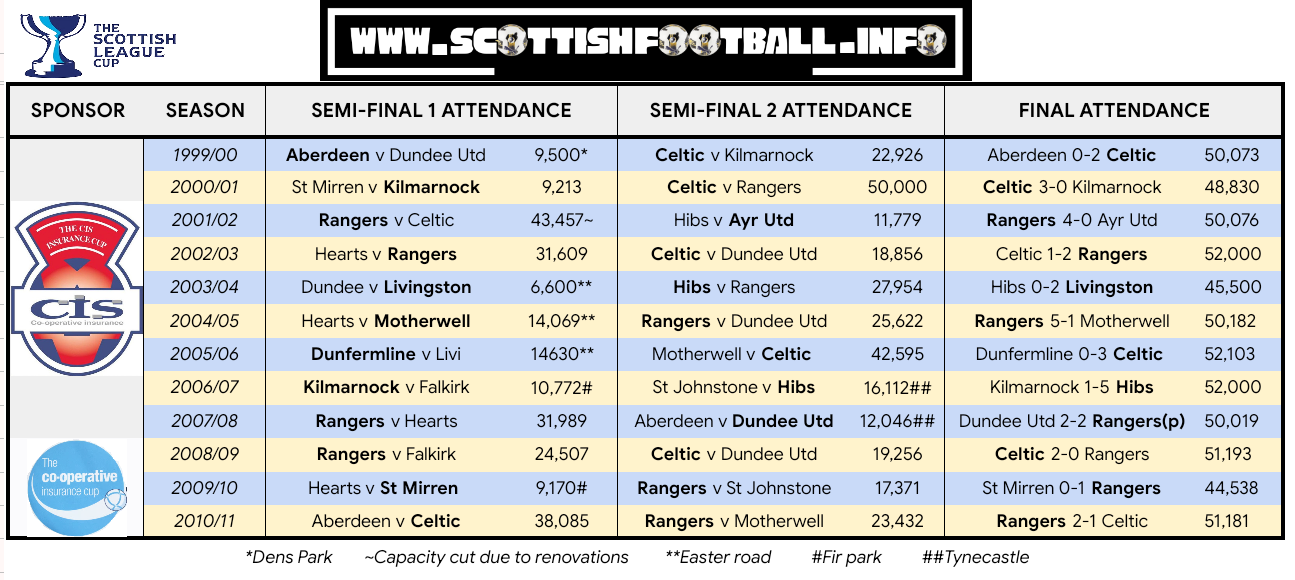 The Semi-Finals are traditionally played at Hampden Park, with the last exception to this coming in 2018/19 when Hearts Vs Celtic was played at Murrayfield in front of the second-biggest crowd at a football match ever held in Edinburgh. This was to avoid two matches at Hampden on the same day, as both Celtic and Rangers (in the other Semi-Final Vs Aberdeen) had Europa League matches on the Thursday night - so both had to play on the Sunday. Similarly, the League Cup final is usually held at Hampden, with the last occasion it was held elsewhere coming in 2013/14, when Aberdeen Vs Inverness Caledonian Thistle was played at Celtic Park because Hampden was being refurbished for the 2014 commonwealth games.