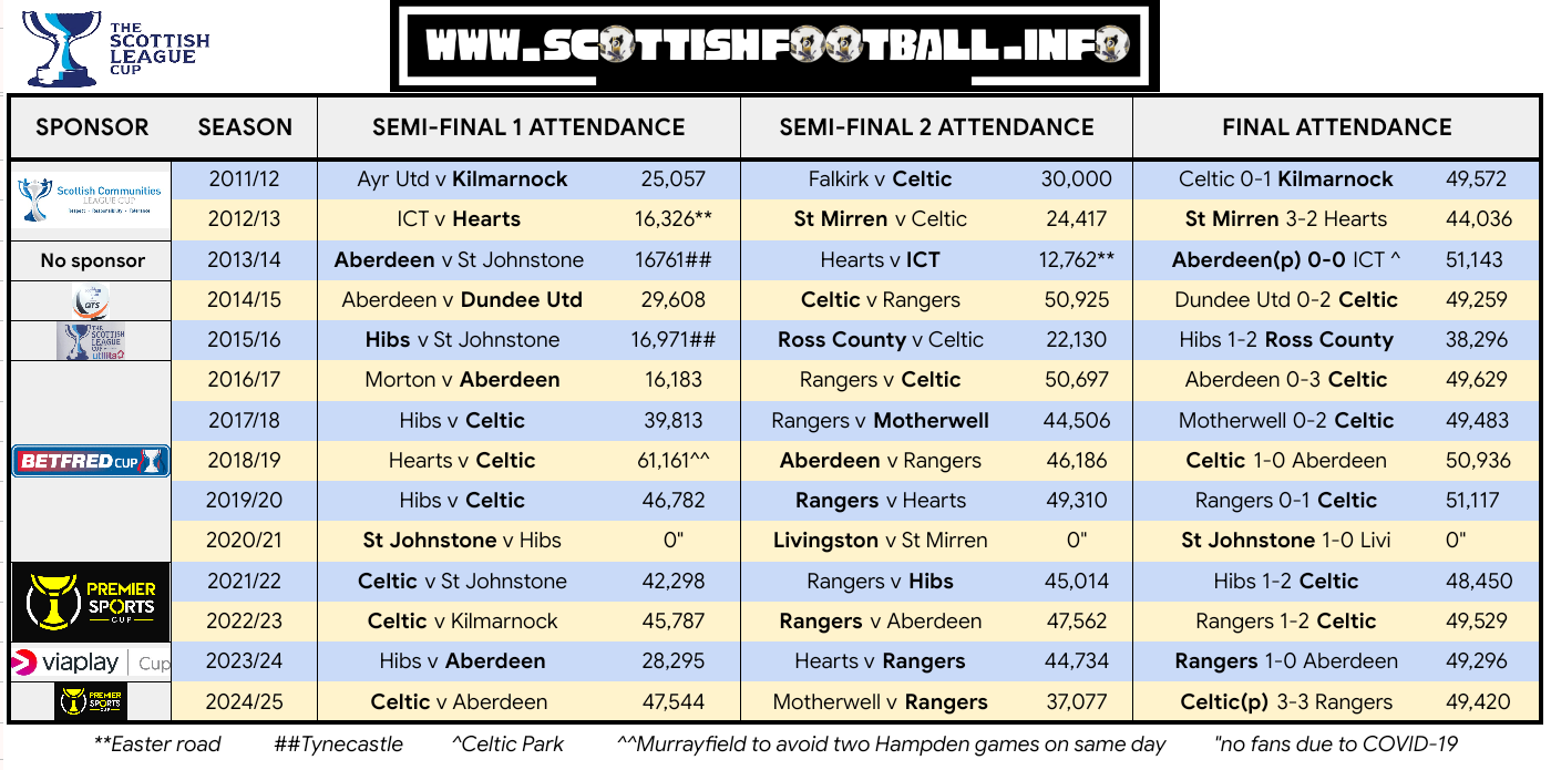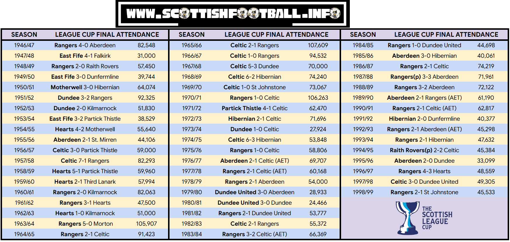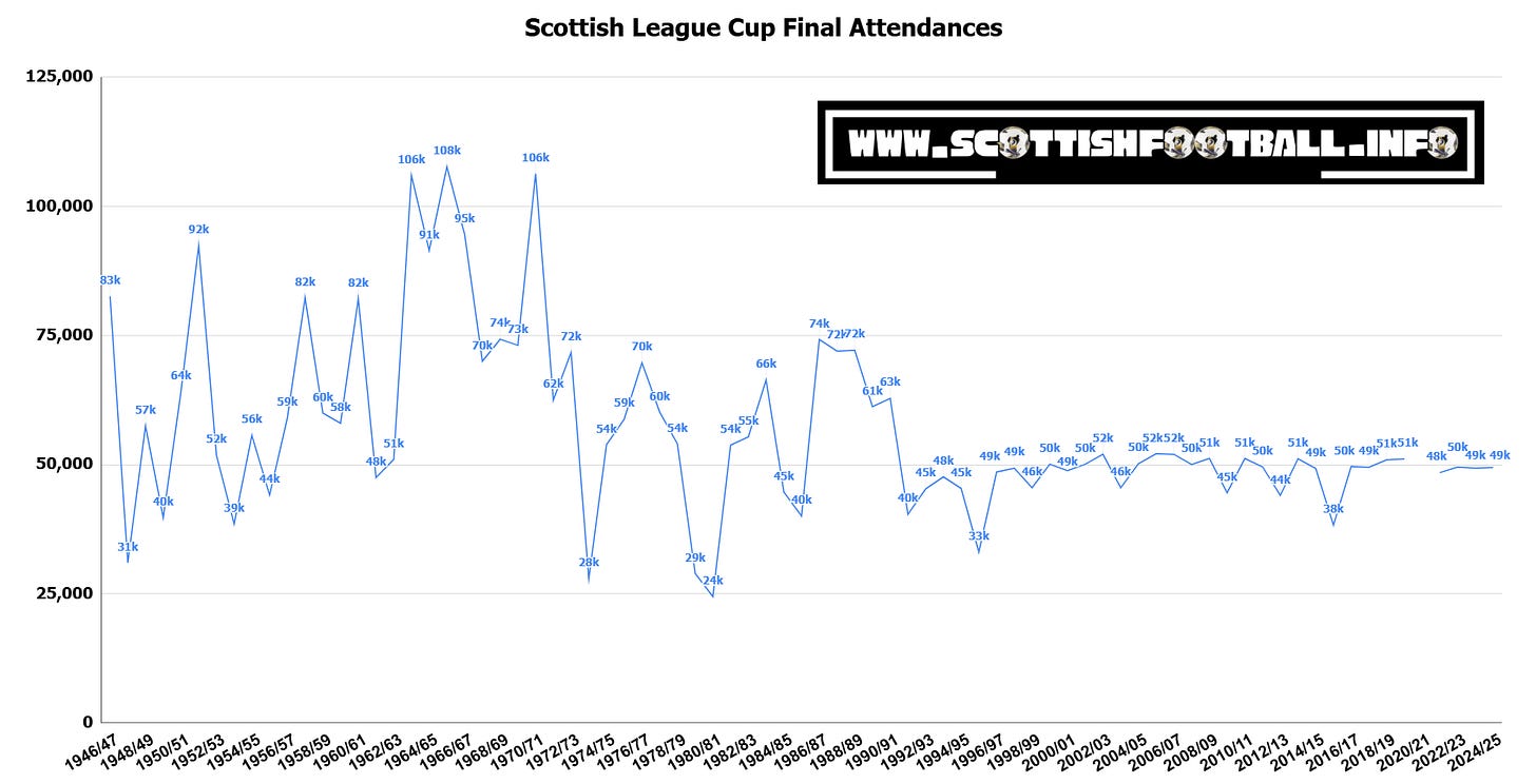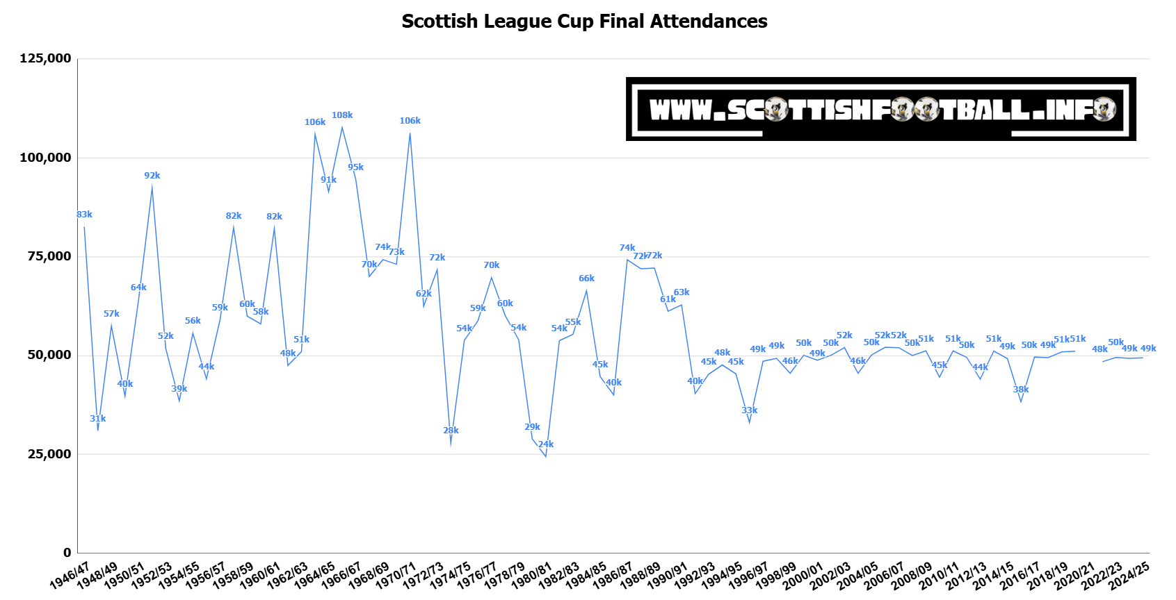 The below charts show the Scottish League Cup Final scores and attendances for every season from 1946/47 until 2024/25.