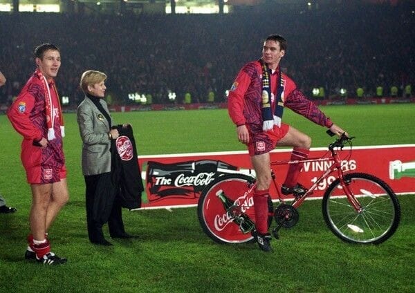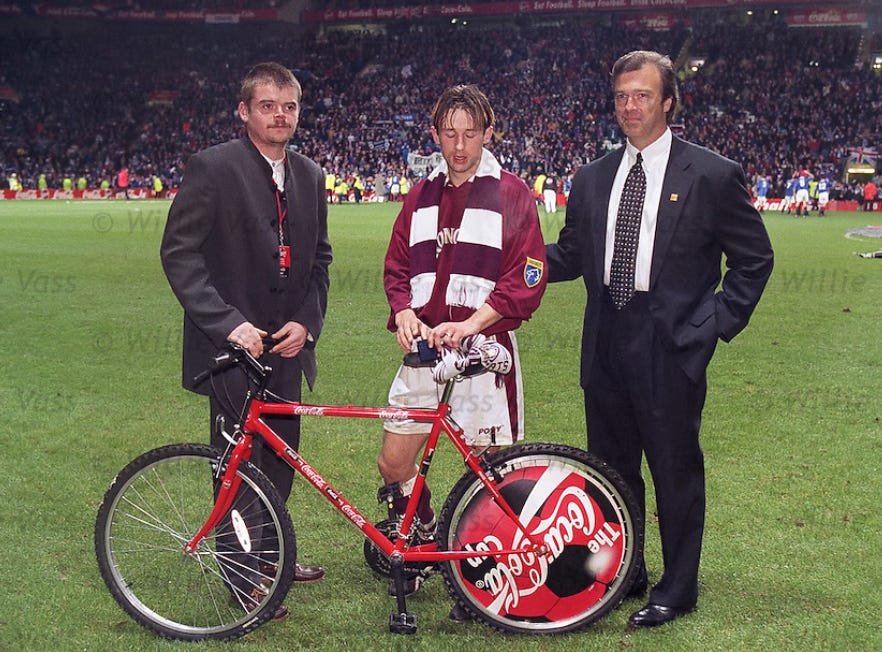 Coca-Cola became League Cup sponsors in 1994, and unlike Skol, they didn’t award a Coca Cola branded trophy. No, instead, they offered the man of the match in the final a Coca-Cola branded bike! Pictured below (thanks to Rangers F.C photographer Willie Vass) is losing Hearts finalist Neil McCann in 1996 receiving his bike, as the victorious Rangers team can be seen celebrating in the background at Celtic Park!
