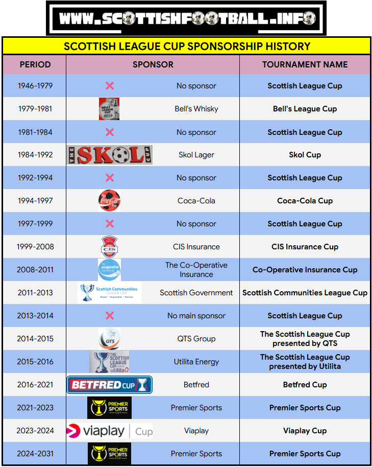 The Scottish League Cup has had various main sponsors over the years, leading to different names for the tournament. In the early years it had no sponsor, but from 1979 onwards commercial sponsorship was becoming more common in football. The SFL signed deals to have their tournament known as the Bell’s League Cup in 1979-81, the Skol Cup between 1984 and 1992 and the Coca-Cola Cup from 1994-1998.