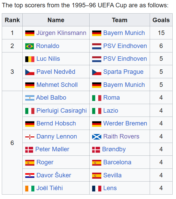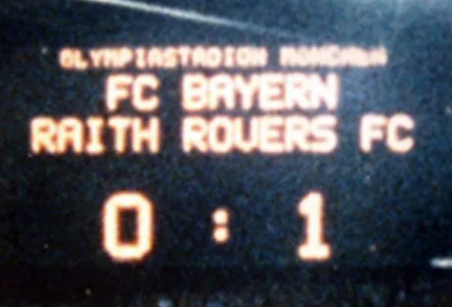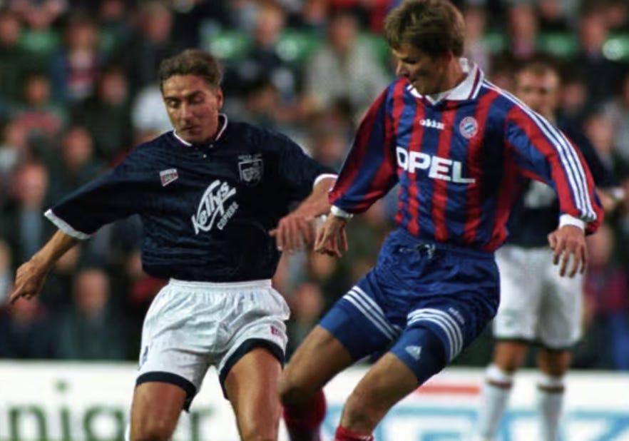 Raith defeated Celtic on penalties to win the league cup in 1994/95, and so qualified for the UEFA Cup in 1995. They drew a Faroese club GÍ (which has since merged with Leirvík ÍF to form Víkingur) in the preliminary round, swatting them aside 6-2 on aggregate, before defeating ÍA of Iceland 3-2 on aggregate in the First round. It was in the Second round (last 32) where the Rovers where paired with the German giants, losing the first leg 2-0 in front of 13,000 at Easter Road, thanks to a Jürgen Klinsmann double. Klinsmann would score 15 in the UEFA Cup that season as Bayern won the tournament, but not before they suffered a scare at home to Raith. Danny Lennon sensationally put the Scots ahead just before half time - his fourth of the tournament - before Klinsmann and Markus Babbel scored in the second half to seal a 4-1 aggregate win for Bayern.