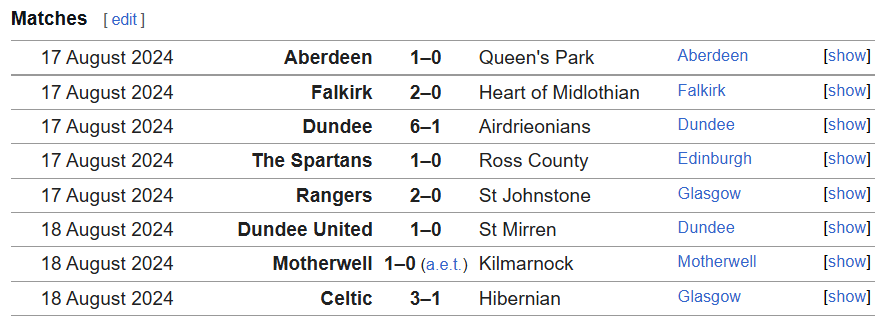Since the 2016 overhaul, the Scottish League Cup begins with an early season group stage and then moves to knockout rounds. There are eight groups of five teams, and each team plays four matches (home or away) in a single round-robin. Unlike the Scottish Cup, which has 130 clubs enter, the League Cup is largely only for the 42 member clubs of the SPFL. All 37 clubs from last season that are not in European competition participate in the group stage, so non-league sides are then invited to round the numbers to 40 teams. If the coefficient continues to fall, this will of course become 38 teams not in Europe + 2 guests, as we will lose a European entrant. This season it was the Highland League champions (Brora Rangers), and runners-up (Brechin City), as well as recently promoted East Kilbride, the Lowland League Champions.