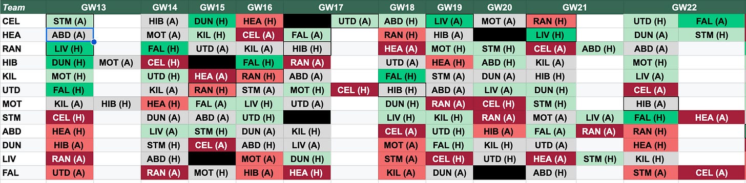 This is the one you must actively plan around. If you triple up on Hibs for GW13, you almost certainly need to roll back to a double-up or less straight afterwards.