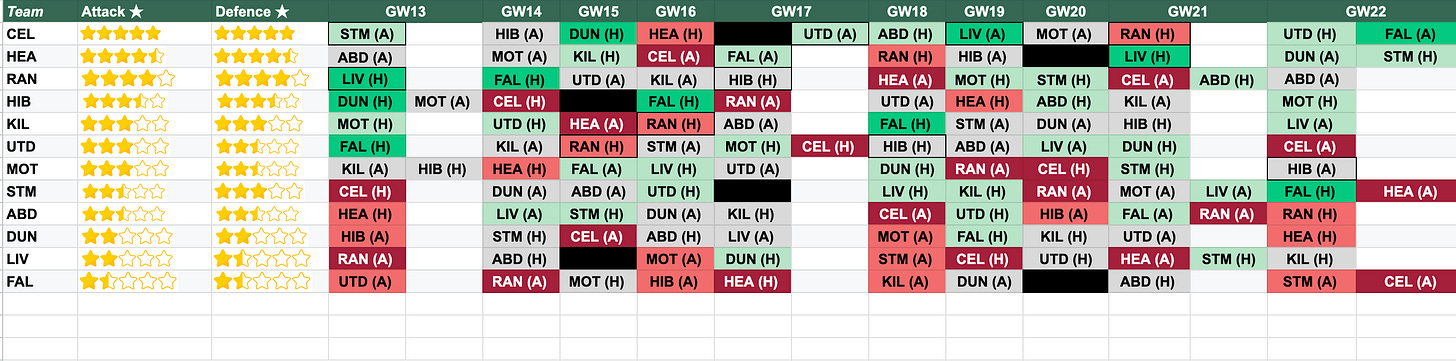 This is the combination that offers genuine explosive upside but beware, it is suboptimal as you’ll likely need to remove Hearts and Celtic midfielders forcing managers into awkward long-term commitments. We won’t want triple Hibs from GW14 so having three of the above five plus a Celtic and/or a Rangers midfielder (who both have a decent fixture) is still worth playing it for me.