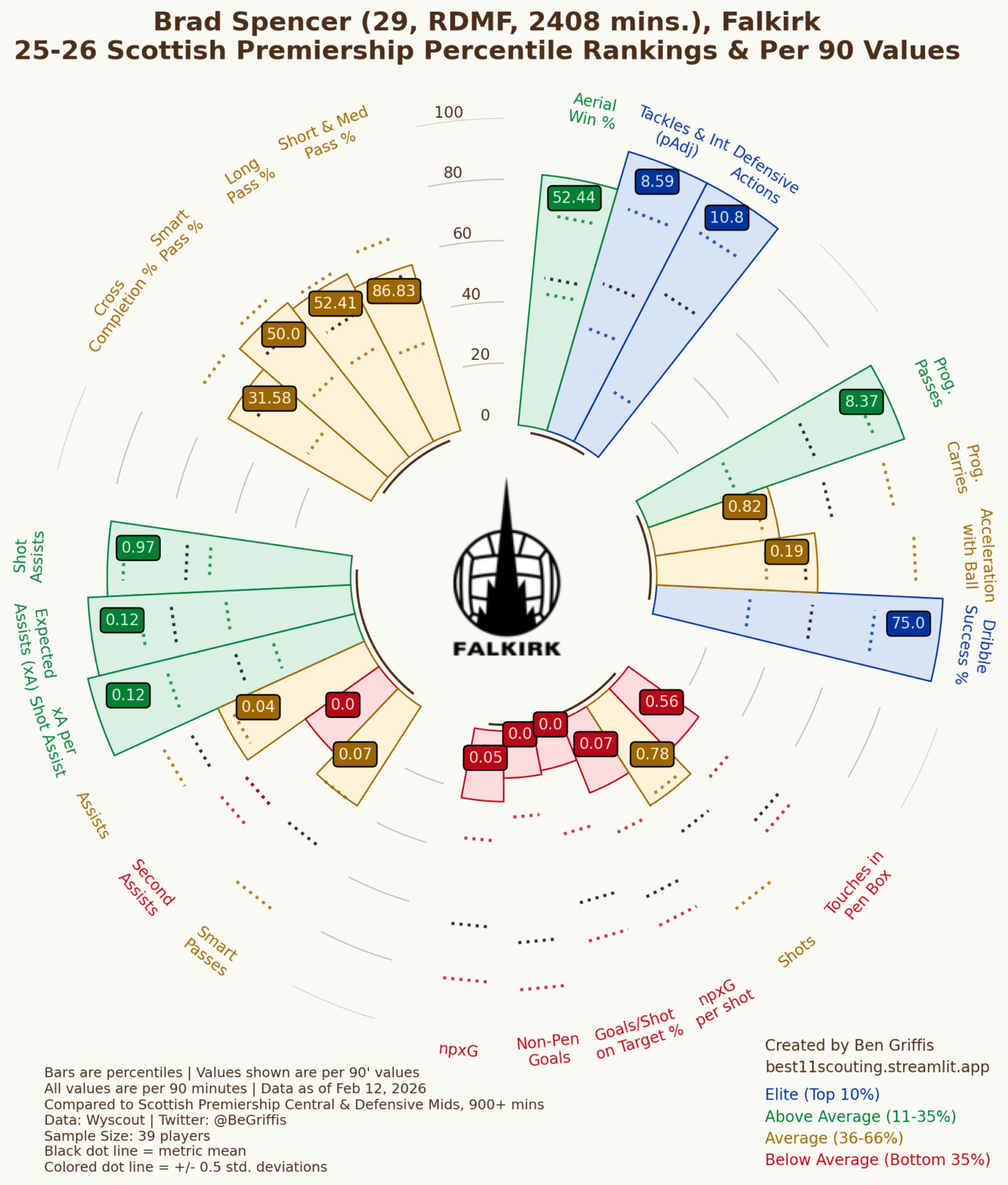 You can see from the below graph that the data backs up these strengths. Spencer is a ball winner who can get his team moving. This is why he is perfect for this Falkirk team and how they like to play.