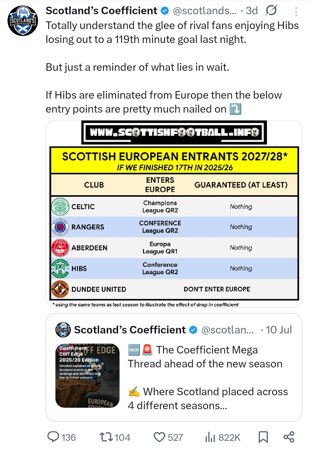 This tweet was seen by over 800,000 people, with a lot of the shares coming from fans that did not realise just how perilous the coefficient situation was. A warm Hello to the tens of new subscribers that signed up to this website as a result of seeing the tweet - I hope you enjoy the content here, where I cover lots of niche aspects of Scottish football, especially the coefficient.
